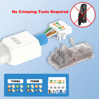 Die ungeschirmten, werkzeuglosen RJ45-Stecker von VCELINK sind mit Cat6-, Cat5e- und Cat5-Litzen- oder Massiv-Ethernet-Kabeln kompatibel. Im Vergleich zu Standard-RJ45-Steckern benötigen sie keine professionelle Crimpzange. Die Installation kann von Hand erfolgen. Ein einfacher Crimpständer (KJ22F) erleichtert die Installation zusätzlich.