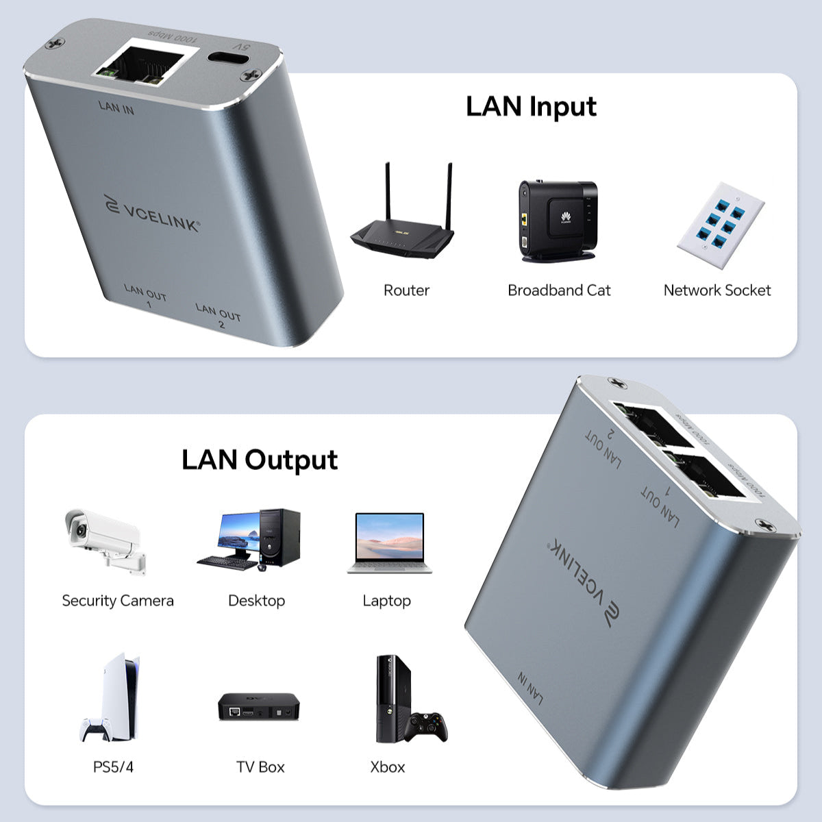 VCELINK Ethernet Splitter 1 to 2 delivers stable Gigabit networking for two devices simultaneously, supporting speeds up to 1000 Mbps. Powered by a USB cable for reliable performance, this compact splitter is compatible with Cat7, Cat6, and Cat5 cables. Ideal for PS5, Xbox, smart TVs, and laptops, it provides a simple solution to expand wired connections without compromising speed or stability.