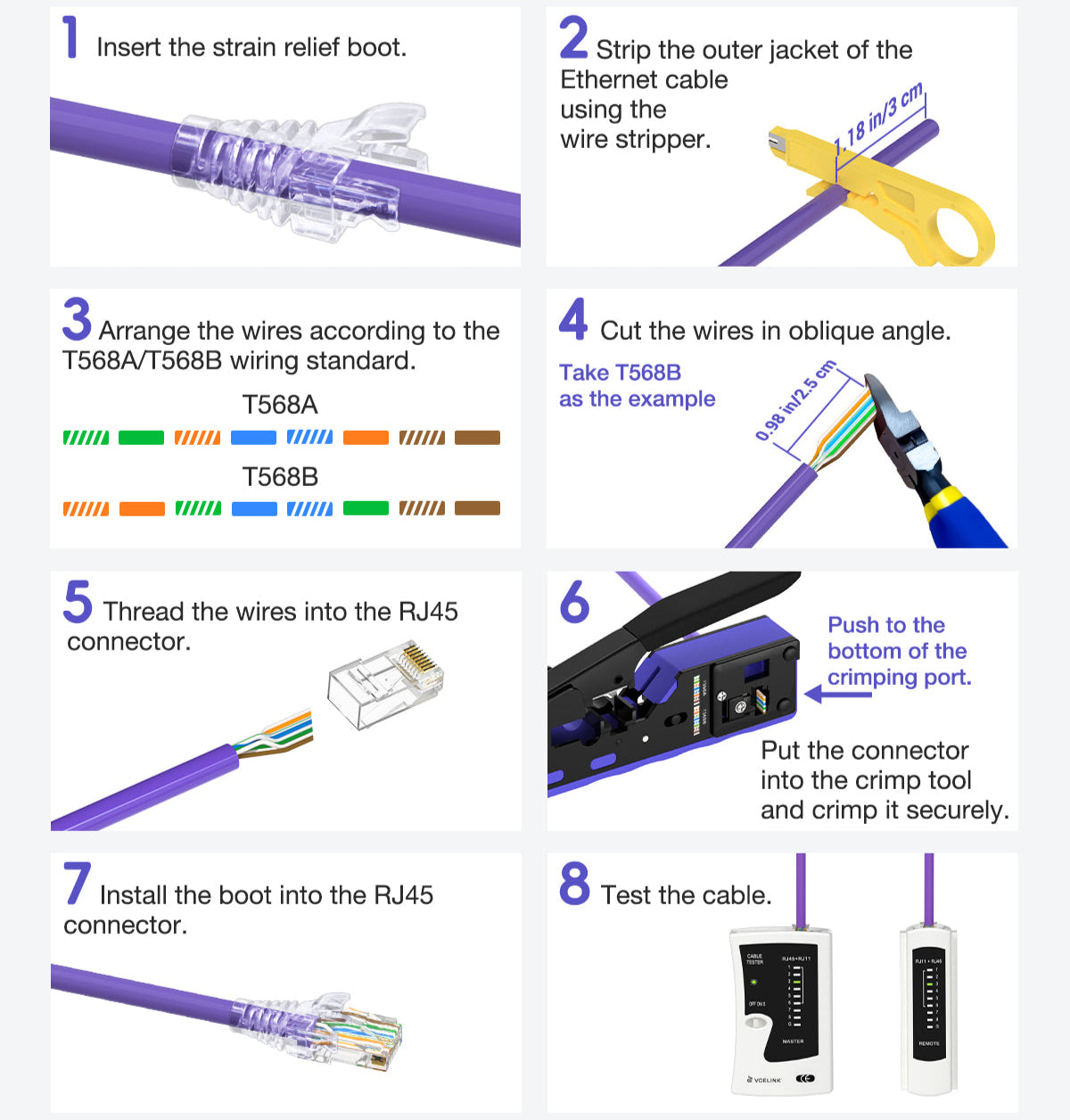 Just slide it onto the cable, then glide it onto the RJ45 connector, and finally terminate it for a perfect installation.