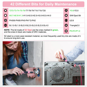 Comes with a wide range of screwdriver bits including slotted, phillips, torx, hexagon, pentagram, triangle, spanner, tri-wing, and SIM eject bits, ideal for different projects, such as smartphone, glasses, and gaming console repair.